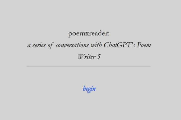 Poemxreader Andrea Fernandez Preview Set against various considerations of the poetic and the digital, poemxreader is a Twine-based interactive piece that reflects on the interplays between reading and writing, cognition and information processing. The project surrounds the poetic capacities of ChatGPT as an NLP (Natural Language Processing) tool, exploring the ways in which its mechanisms may resonate with or rub against longstanding poetic conventions in “unconscious” or free associative writing practices. To this end, it looks into the processes by which Poem Writer 5.1. “predicts” the next most likely word in a given response sequence, positioning this as a potential analogue or counterpoint to cognitive free association. Here, the prompt becomes a stable frame, moving across controlled variations in voice, rhyme, theme and metaphor, and opening up later into free associative reflection. Taking viewers through a series of “conversations” between a semi-fictional ‘User’ and the AI ‘Poem Writer’, the passages in poemxreader are constructed along the usual features of generative writing at large; all movements are dependent on the reader’s choices. Mingling the formal features of poetry, prompt-and-response and gameplay/interactive text, this opens up insights into the dynamics of reading and writing as formed in relation to each other, urging us to question their conventional subject-positions through the synthesis of AI-generated poetry Author Profile Andrea is an undergraduate student at Ashoka University, pursuing English, Creative Writing, Performing Arts and Political Science. GO TO WORK
